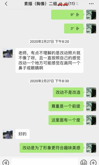 3.每次上课前来点评学生上传到微信群的作业,上交作业要求学生用录视频和拍照片的方式,录视频的同时需要说出自己作业出现哪些亮点和不足之处,这样可以全方位的了解学生的课堂掌握情况,从而进行个人指导。