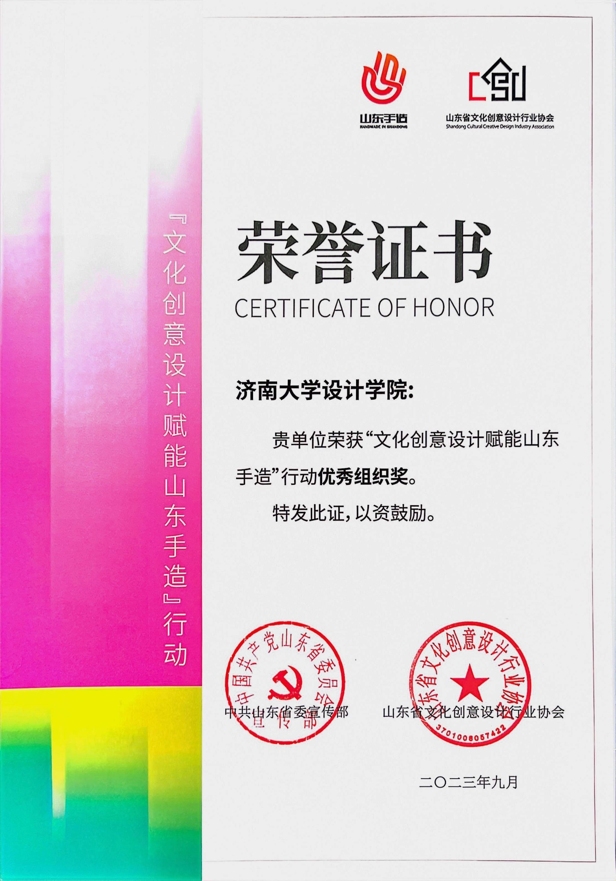 近日,由山东省委宣传部主办,山东省十六地市委宣传部和山东省文化创意设计行业协会共同承办的“文化创意设计赋能山东手造”行动赋能团队颁奖活动举行。我校美术与设计学院副院长杨海波所率团队深入各地非遗工作室、文创企业开展系列公益宣讲、专题培训、设计工坊并结合访企拓岗等活动,以其良好的各界反响获颁“优秀组织奖”。