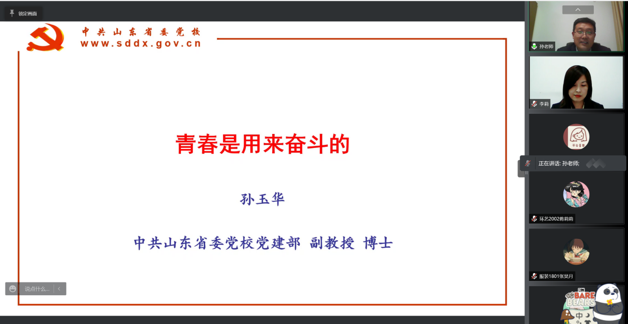 3月26日晚,成人短视频 线上开展“青春是用来奋斗的”主题党课,特邀中共山东省委党校(行政学院)党建部孙玉华教授主讲,学院学生党支部书记、全体学生党员和入党积极分子共计260余人参加,本次主题党课由成人短视频 党委副书记、副院长李莉主持。