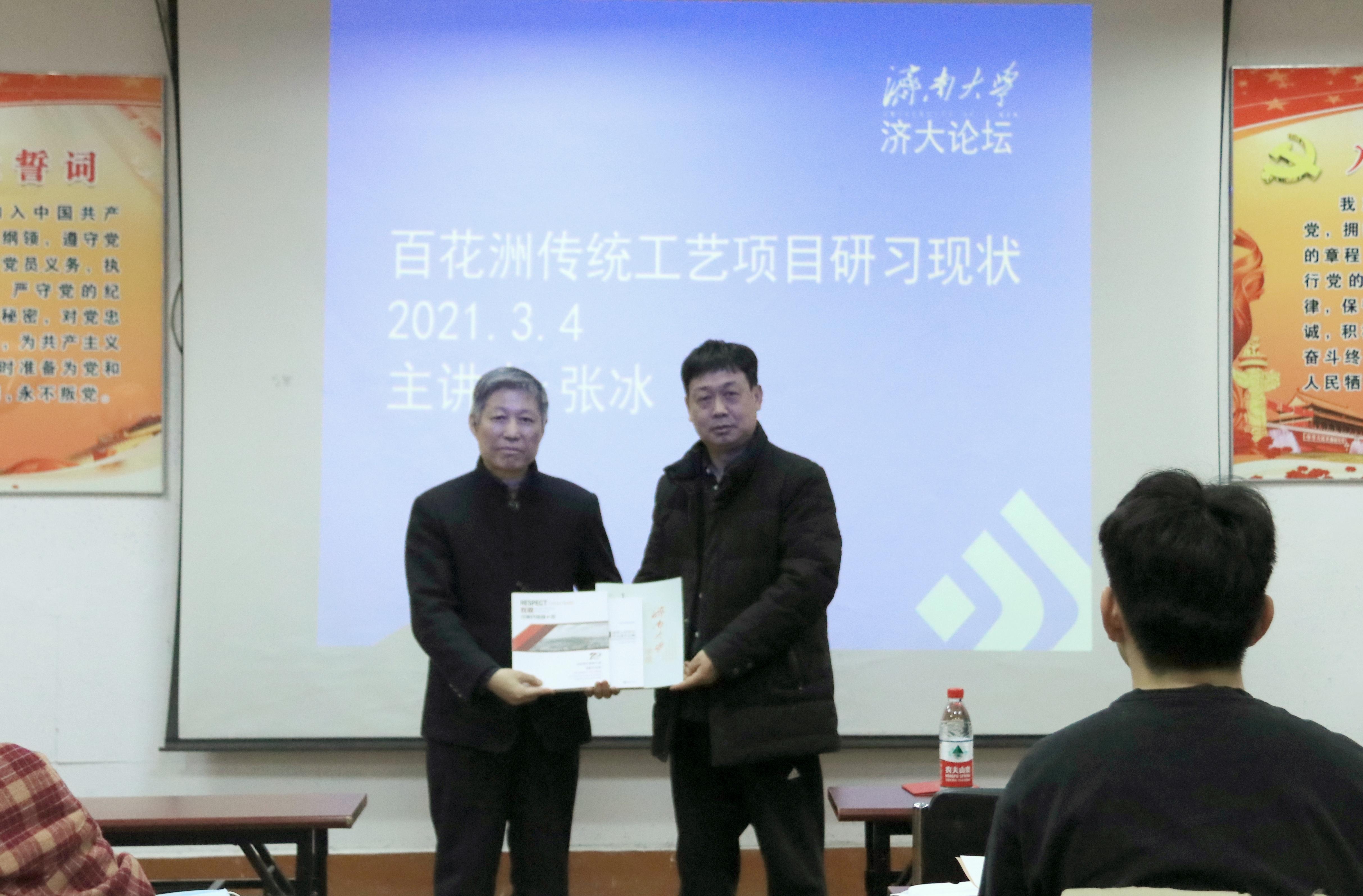 学报、美术与设计学院研究生作品集。在同学们热烈的欢迎后,张冰先生向同学们介绍了“济南百花洲传统工艺工作站”的非遗、手工艺项目保护发展现状。