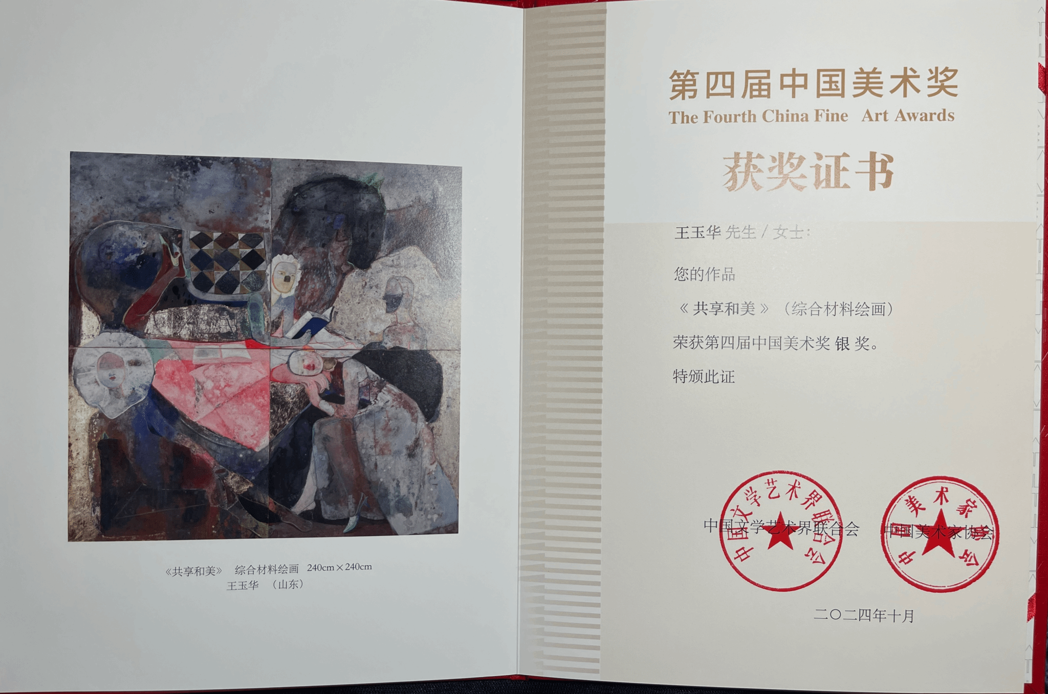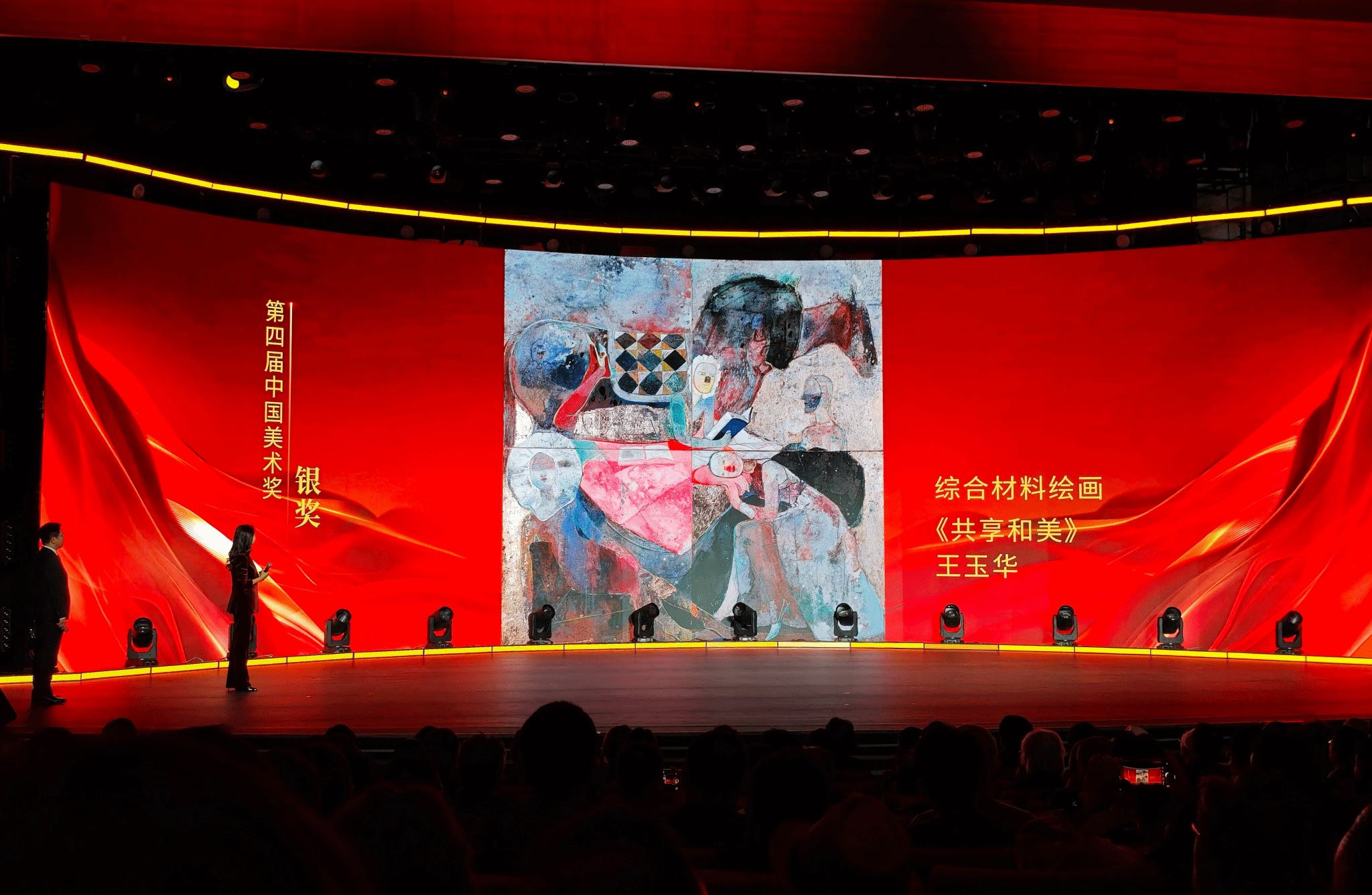 美术与设计学院美术系综合材料绘画教研室主任王玉华副教授的综合材料绘画作品《共享和美》,荣获第四届“中国美术奖”银奖,这不仅是全国十四届美展综合材料绘画领域的最高奖项,更代表着我校美术综合材料绘画首次在“中国美术奖”评选中取得重大突破,为我校赢得了极高的荣誉与肯定。