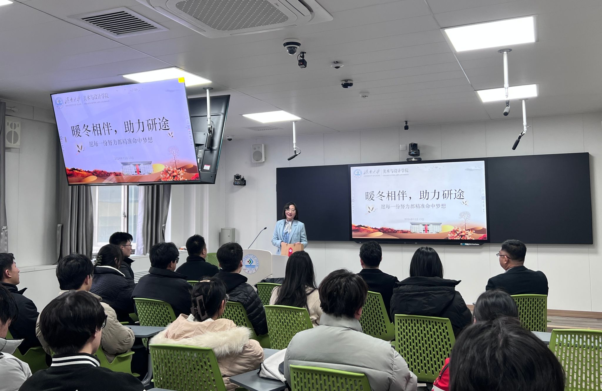 为进一步落实“三全”育人理念,切实关心关爱学生,提升考研学子的备考信心,12月13日下午,美术与设计学院在4教307教室举办“暖冬相伴,助力研途”考研送温暖活动。学院党委书记陈春锋,副院长杨海波,党委副书记、副院长何贵亮,毕业班辅导员,2025届考研学生代表40余人参加活动。