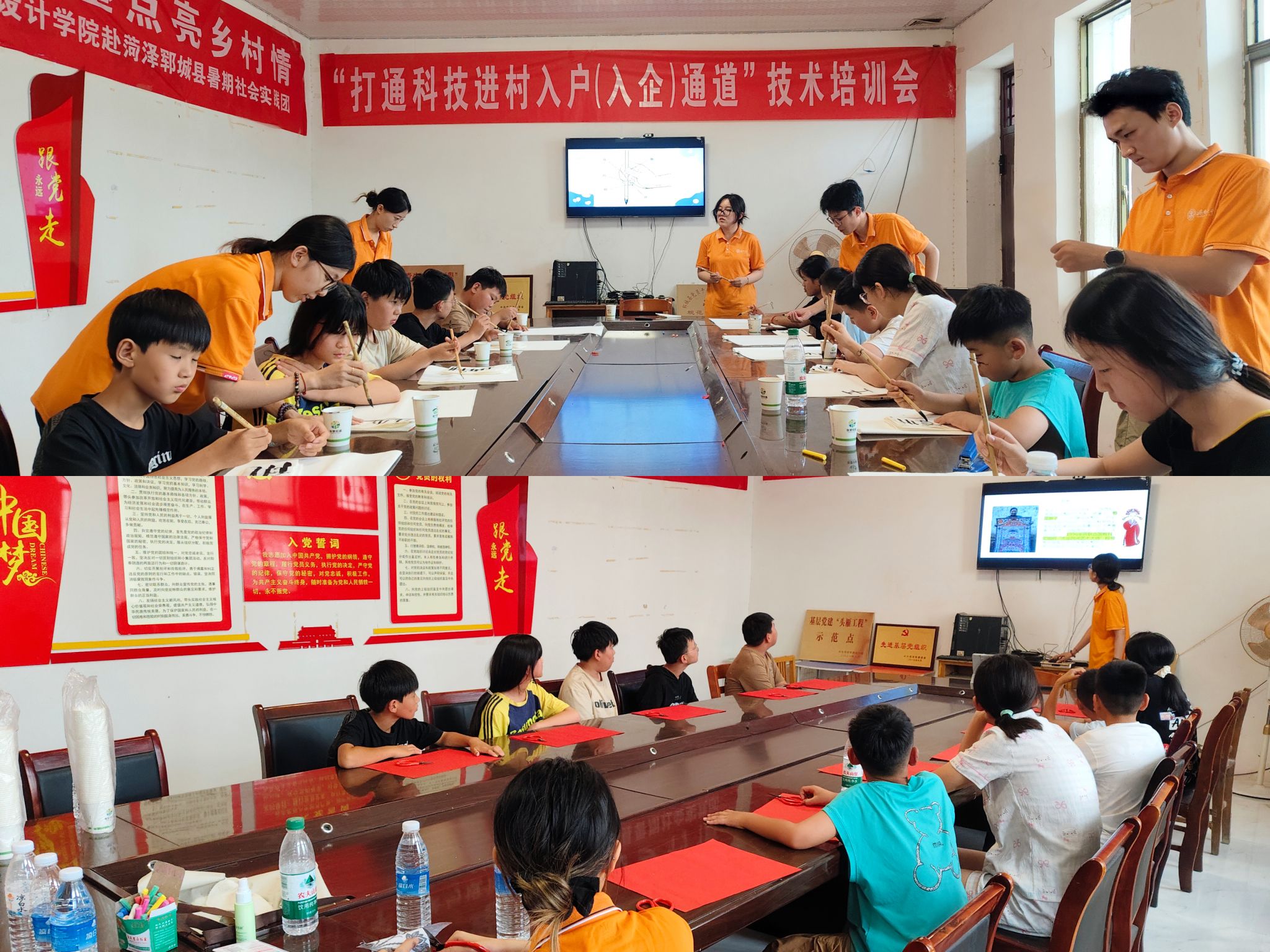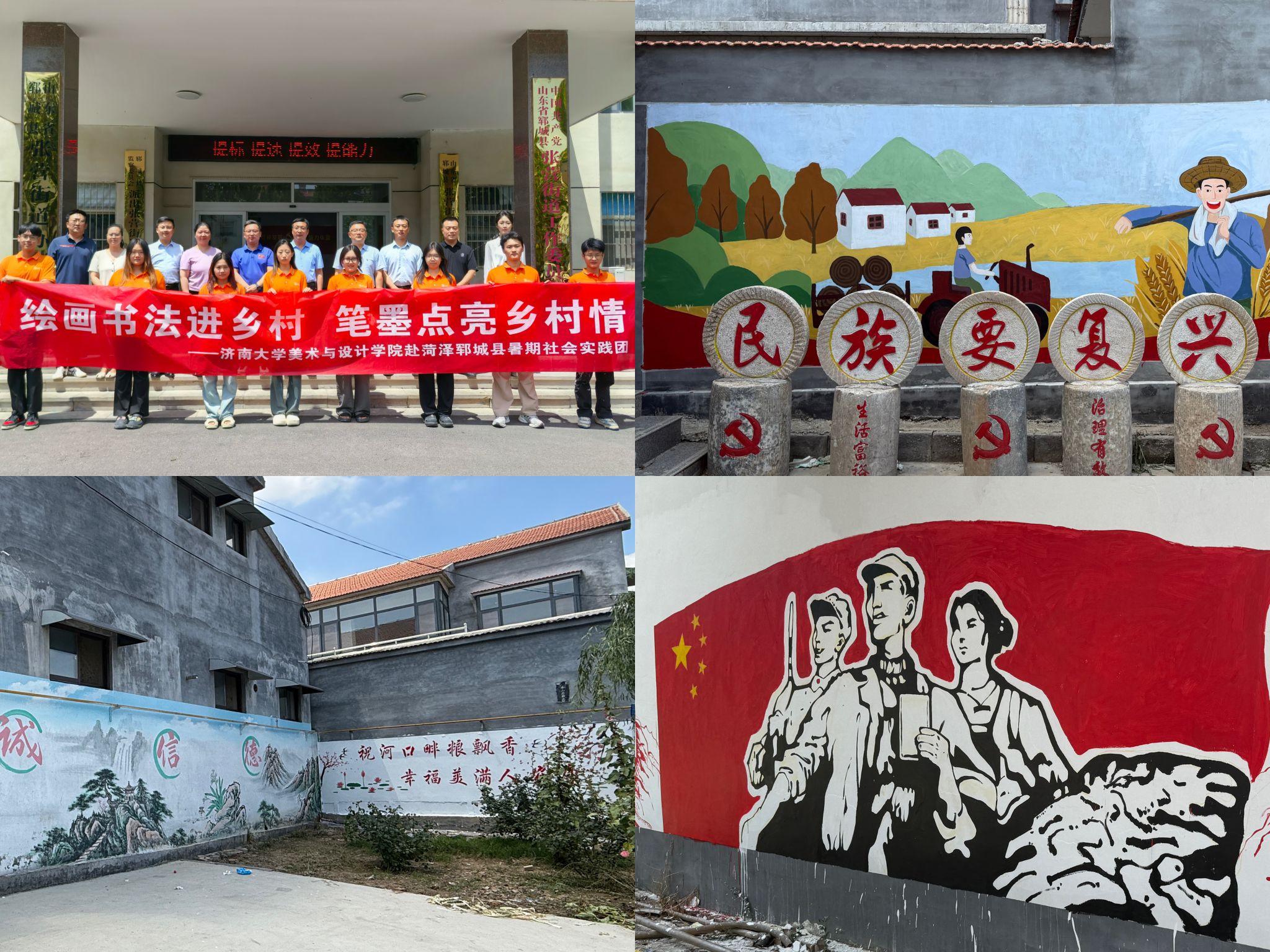 为深入学习贯彻习近平总书记关于青年成长成才的重要论述和关于乡村振兴、美育工作的重要指示精神,进一步引导广大青年学生在社会课堂中受教育、长才干、作贡献,7月6日至12日,美术与设计学院组织社会实践团队,分别奔赴日照五莲县与菏泽郓城县,开展以“以美润心,以笔绘兴”及“绘画书法进乡村,笔墨点亮乡村情”为主题的暑期“三下乡”社会实践活动。